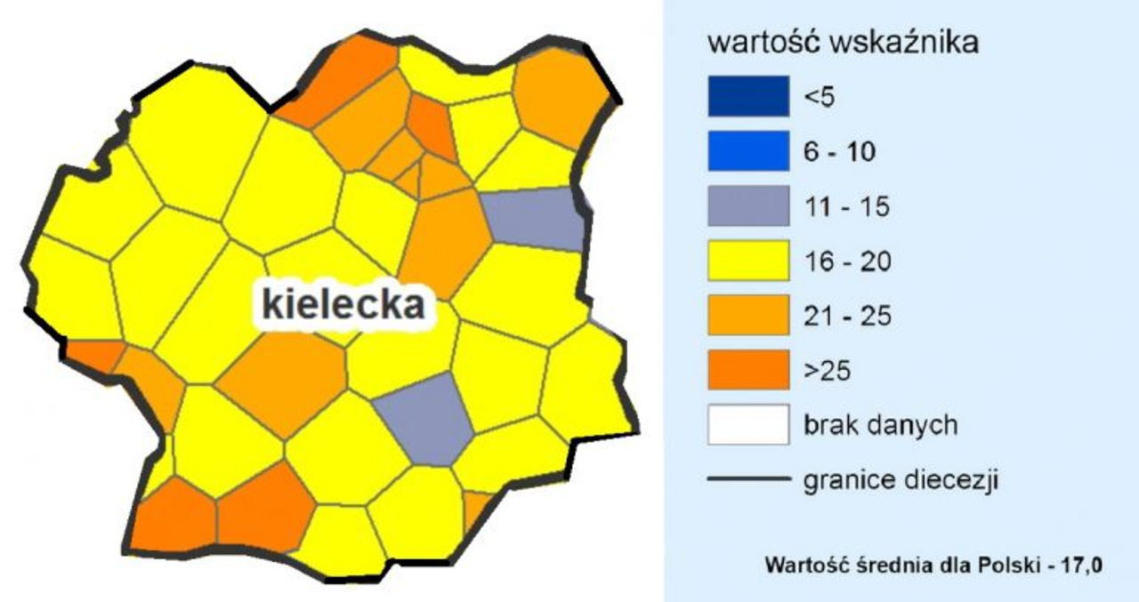 Jeśli chodzi o przyjmowanie Komunii świętej – w większości nasza diecezja utrzymuje się pod tym względem na średnim poziomie, czyli od 16 do 20 procent uczestników Mszy świętej. Powyżej średniej wypadają dekanaty północne, czyli łopuszański, piekoszowski czy kielecki oraz te, które są bliżej południowych granic diecezji: skalski, słomnicki i skalbmierski. Tam Komunię przyjmuje powyżej 20 procent uczestników Eucharystii.