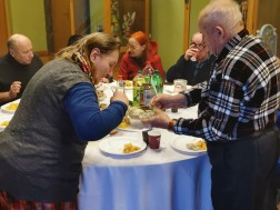 – Przychodzę tu już drugi rok z rzędu. Biorę małą rentę, jestem samotna, a pod opieką mam córkę, która choruje na padaczkę. Czuć to ducha świąt Bożego Narodzenia. Śpiewamy kolędy. Jest pięknie – mówi pani Tosia. – Trzeba uczcić święta. Są tu dobrzy ludzie. Wszyscy zachowują się kulturalnie – dodaje pan Leszek.