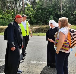 Na trasie pielgrzymi wysłuchują konferencji prowadzonych przez ks. Grzegorza Stachurę i ks. Jana Jagiełkę.
