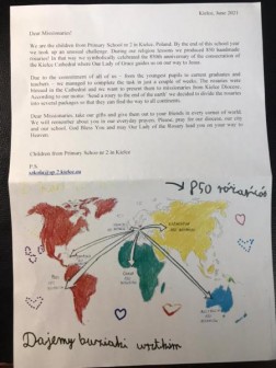 Drogi Misjonarzu! Prosimy, przyjmij od nas i przekaż ten podarunek swoim przyjaciołom „na krańcu świata”. Będziemy pamiętać o Was w naszych dziecięcych modlitwach. Wy zaś pomódlcie się za naszą diecezję, nasz miasto i naszą szkołę. Niech Wam Pan błogosławi, a Matka Boża Różańcowa niech będzie Wam Przewodniczką na drodze do nieba.