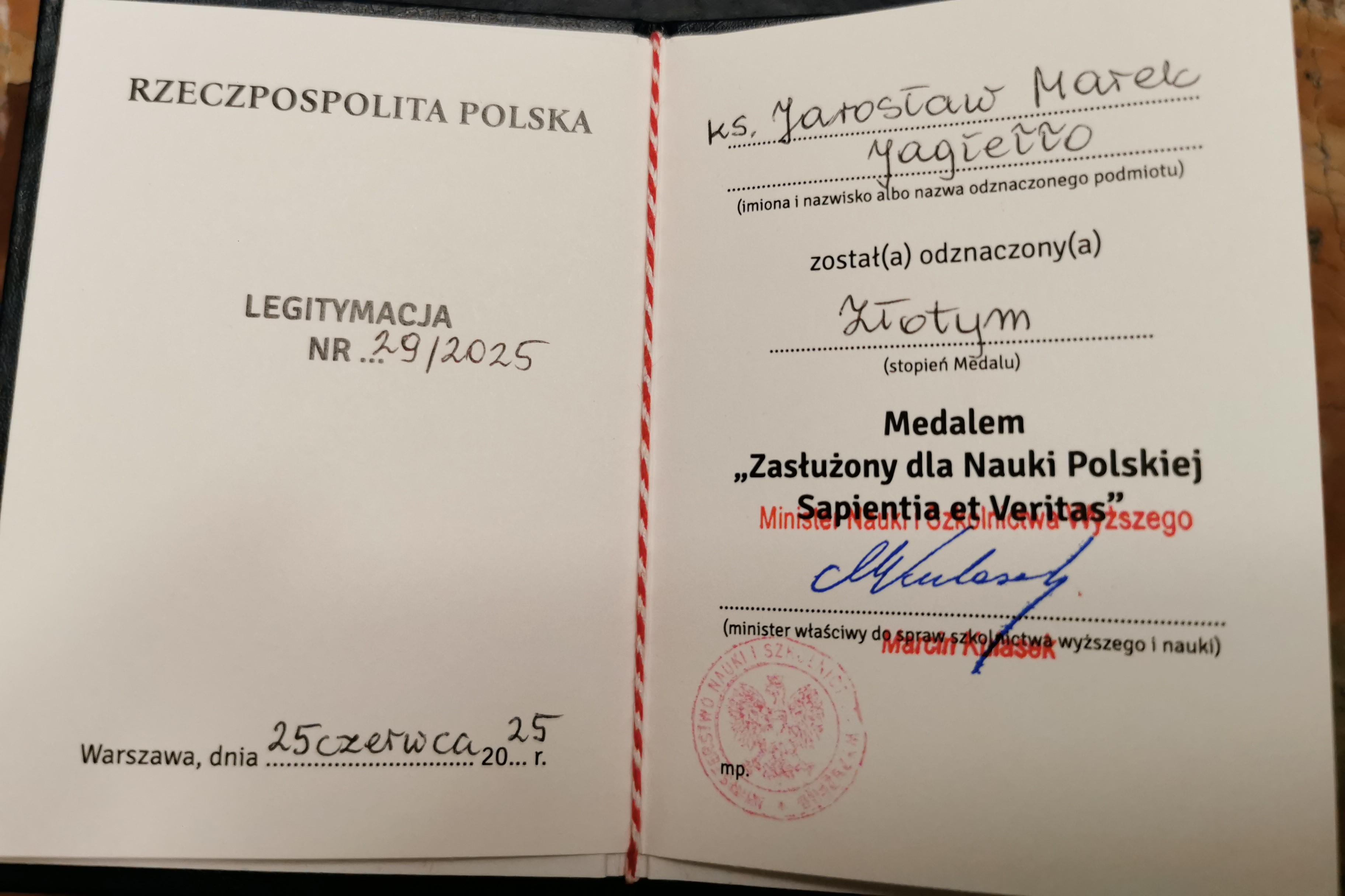 Ks. prof. Jarosław Jagiełło został nagrodzony Złotym Medalem „Zasłużony dla Nauki Polskiej Sapientia et Veritas”. To najwyższe wyróżnienie w świecie nauki w Polsce.