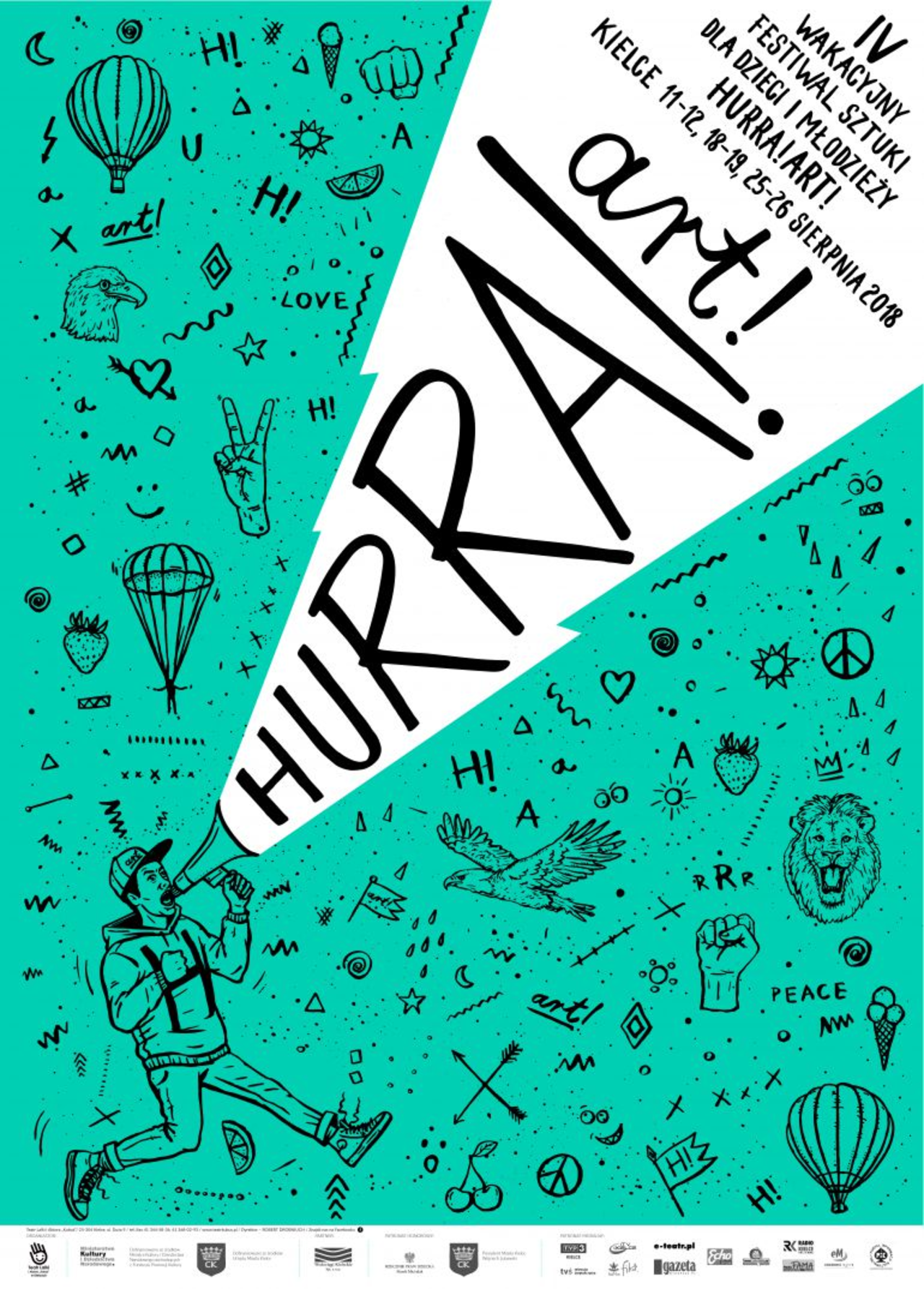 Tegoroczna edycja Festiwalu Hurra!Art! odbędzie się pod hasłem "Odwagi". Wydarzenie obejmie trzy weekendy sierpnia, to jest 11-12, 18-19 i 25-26, obfitujące w przedstawienia, słuchowiska, pokazy filmów oraz warsztaty dla dzieci i rodziców. Program festiwalu adresowany jest do całych rodzin. W Kielcach nie zabraknie spektakli aktorskich, ale pojawią się też przedstawiania czerpiące z teatru ruchu, tańca i scenicznej improwizacji. Dla najmłodszych dzieci przygotowano przedstawienie „Mała wielka podróż” wyprodukowane przez Art Fraction Foundation i Open Window Theatre, we współpracy z Teatrem Narodowym w Bergen oraz „Kuuki” autorstwa Japan Union of Theatre Companies for Children and Young People. Z kilkulatkami warto obejrzeć „Małą drakę o zwierzakach” Opolskiego Teatru Lalki i Aktora im. Alojzego Smolki, improwizowane show Pauliny Drzastwy i Katarzyny Lalik „Kula Zabawula” oraz „Dwie wyspy” z Teatru Lalki i Aktora „Kubuś” w Kielcach. Dla dzieci nieco starszych, w wieku od 7 lat, wystąpi białostocka Grupa Coincidentia, która zaprezentuje spektakl „Straszka pospolita”.