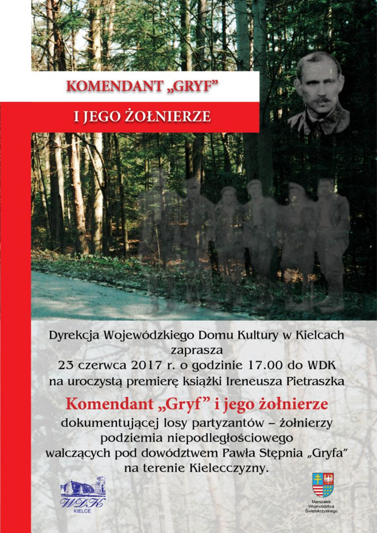 W najbliższy piątek 23 czerwca o godzinie 17 w Wojewódzkim Domu Kultury w Kielcach odbędzie się uroczysta premiera książki „Komendant GRYF i jego żołnierze” autorstwa kieleckiego regionalisty Ireneusza Pietraszka.