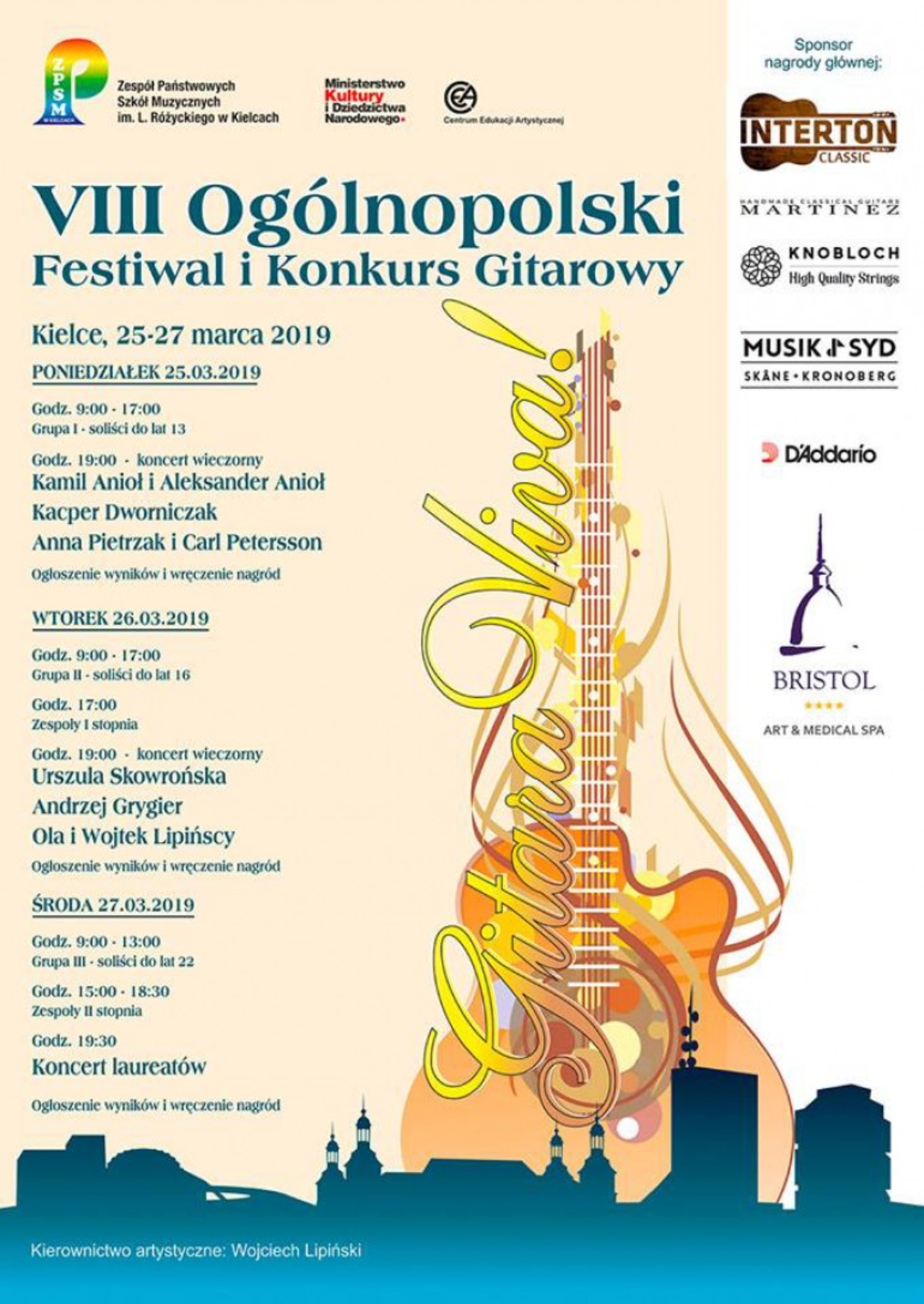 VIII Ogólnopolski Festiwal i Konkurs Gitarowy "Gitara Viva!" będzie odbywał się od 25 do 27 marca w Zespole Państwowych Szkół Muzycznych im. Ludomira Różyckiego w Kielcach. W konkursie weźmie udział pond sto osób m.in. z Gdańska, Warszawy, Poznania, Wrocławia, Krakowa i Wadowic. Młodzi wykonawcy będą rywalizować w pięciu kategoriach i będą to soliści do lat 13, 16 i 22 oraz zespoły I i II stopnia. Przesłuchania będą odbywać się w poniedziałek od godziny 9 do 17, we wtorek od 9 do 18, a w środę od 9 do 13 i od 15 do 18.30.