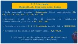 – W apogeum, czyli 1 listopada, uruchamiamy 10 specjalnych linii – od C1 do C10 – które będą obsługiwać wszystkie kieleckie cmentarze. Dodatkowo wzmocnione zostaną linie 4, 30 i 44, kursujące jako 4C, 30C i 44C – przekazała Barbara Damian.
