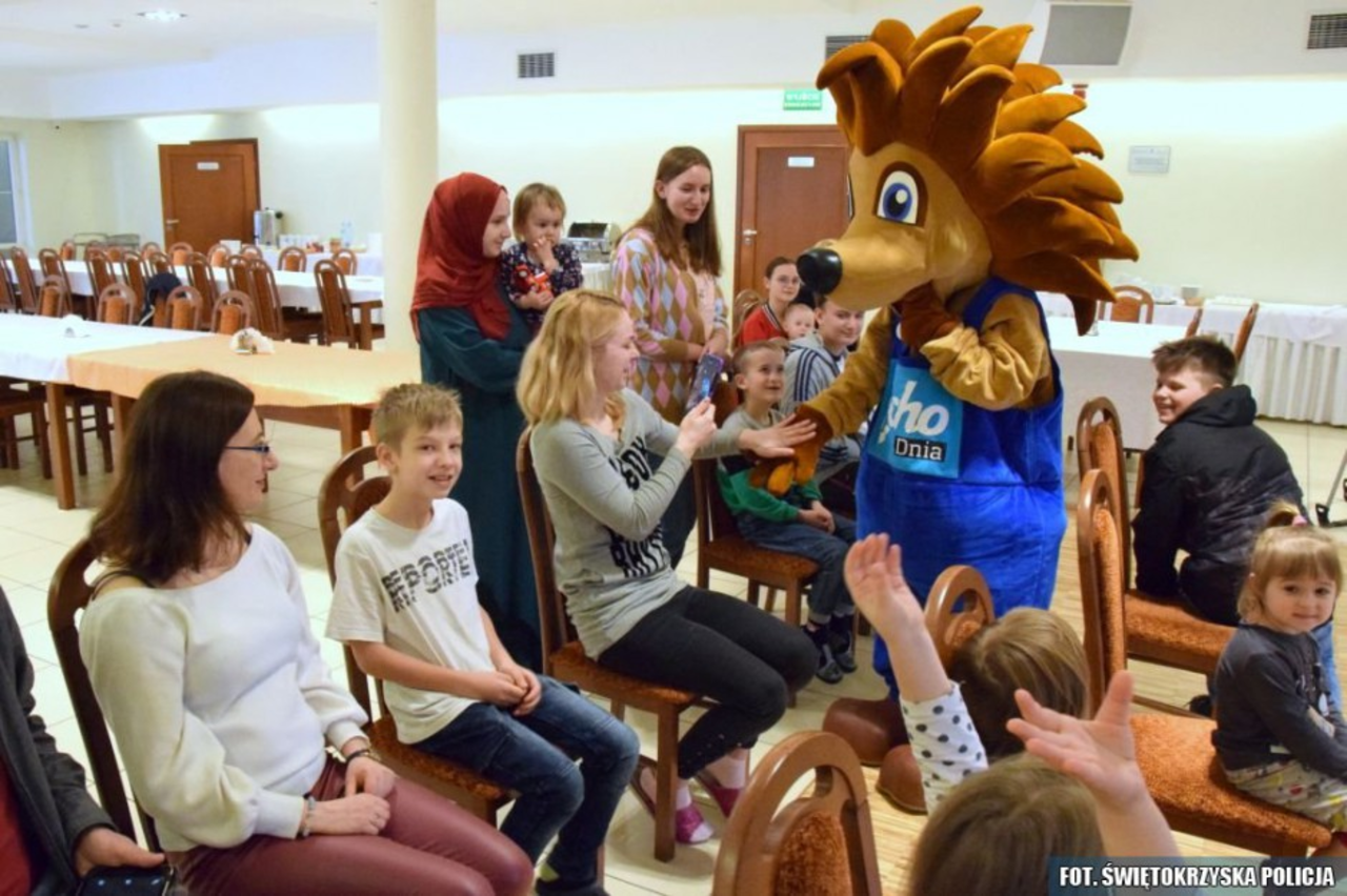 Już po raz kolejny Koziołek Spoko wraz z jeżem Edkiem spotkali się z przebywającymi w naszym regionie uchodźcami z Ukrainy. Maskotki omawiały z dziećmi zasady bezpieczeństwa i przypominały, że policjanci są po to, by pomagać i chronić.