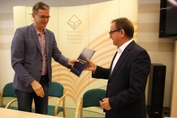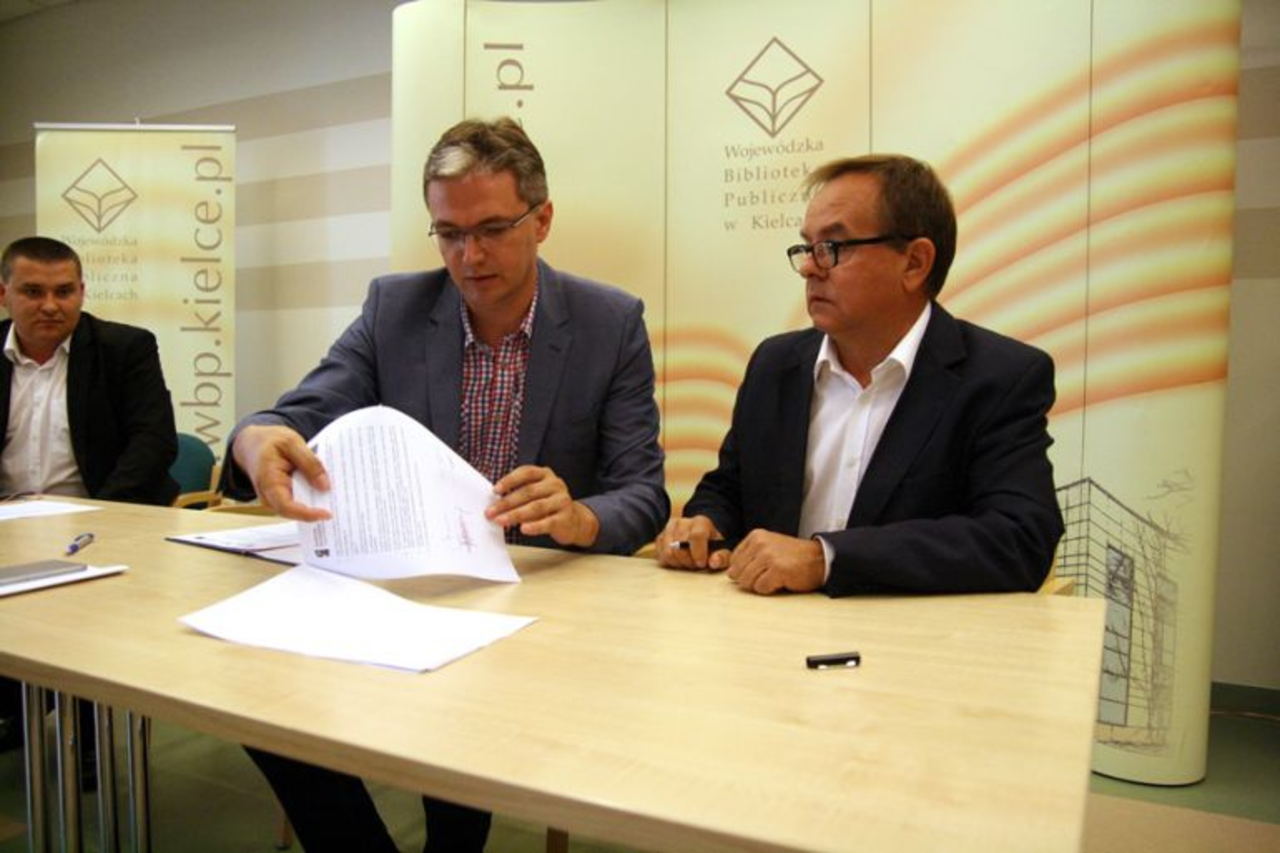 −z Andrzejem Dąbrowskim, dyrektorem Wojewódzkiej Biblioteki Publicznej w Kielcach na projekt „Rozwój zasobów WBP im. Witolda Gombrowicza w Kielcach – Centrum Multimedialne” (całkowita wartość przedsięwzięcia to 15 mln 89 tys. zł, w tym 12 mln 71 tys. zł dotacji z RPO),