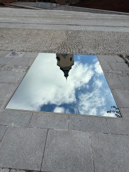 Jak czytamy w opisie instalacji autorstwa Marka Cecuły: „Szklana tafla o wymiarach 2 m x 2 m z powłoką lustrzaną została osadzona w powierzchni chodnika, integrując się z otoczeniem i tworząc w płaszczyźnie placu efekt ruchomego obrazu”.