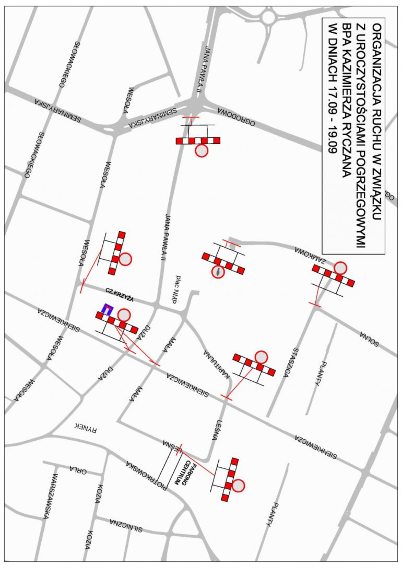 Od dnia 17.09 br. (niedziela) od godz. 21.30 do dnia 19.09 br. (wtorek) do godz. 23.00 zamknięte dla ruchu kołowego zostaną następujące ulice: