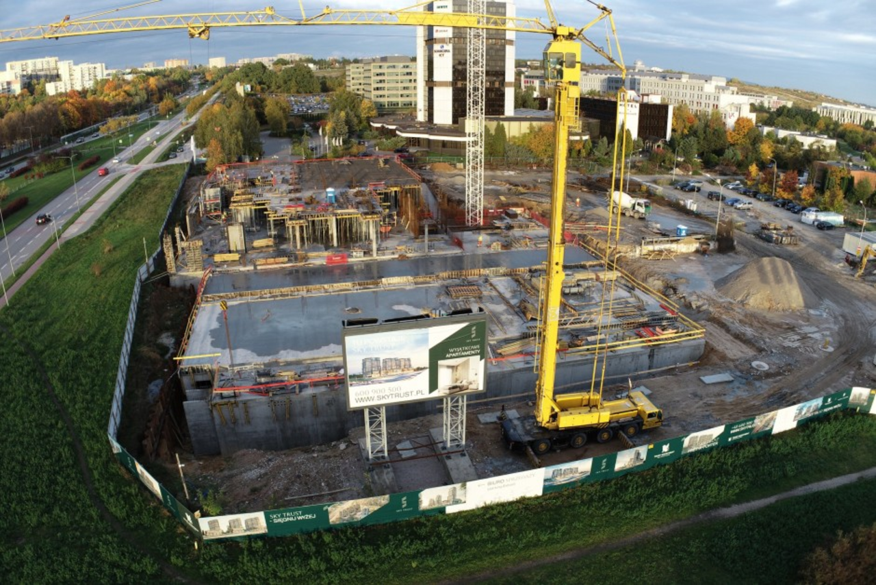 Budowa Sky Trust, czyli do tej pory najwyższych budynków w regionie świętokrzyskim, postępuje. Jak informuje deweloper, zakończono już prace przy ścianach parteru, stropie nad garażem i rampach zjazdowych.