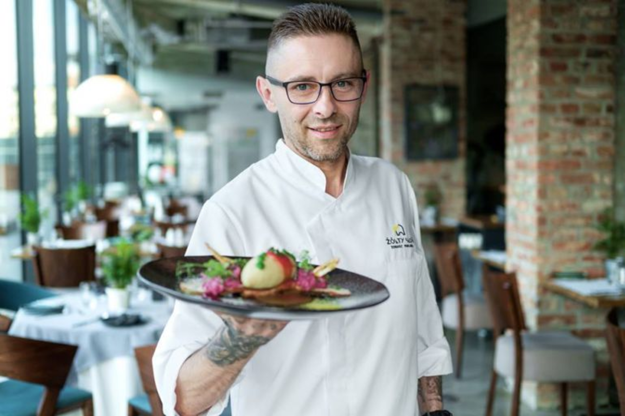 Karczma Kuźnia Smaków Przystawka - Krem z pieczonego buraka Lokalny ser Franciszek, świeży tymianek. Danie główne- Smażone pierogi z lokalną szarpaną wieprzowiną. Wiejska kwaśna śmietana, sos śliwkowy, szczypiorek. Deser: Marchwiak z kremowym miodem świętokrzyskim