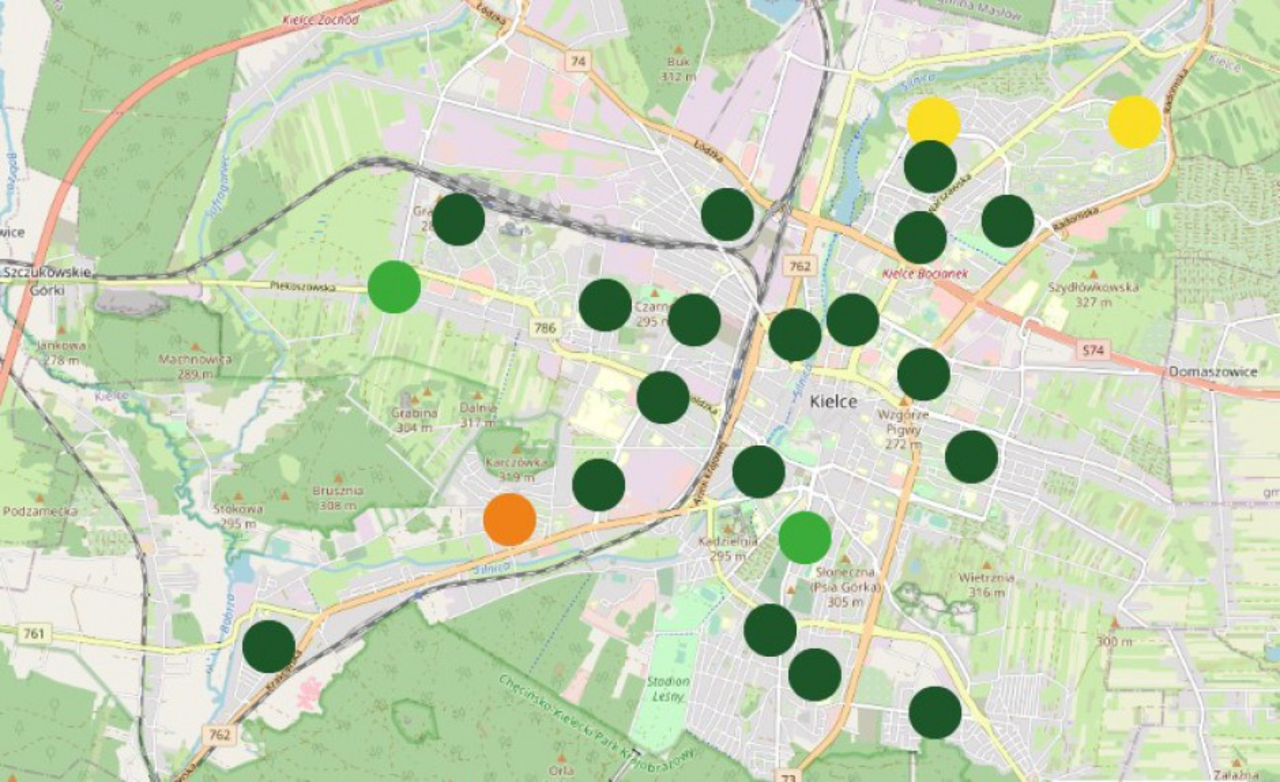 Zgodnie z kielecką mapą czujników jakości powietrza, najlepiej jest na ulicy Hauke-Bosaka, gdzie wczoraj był największy smog. Ciemnozielone kropki to również między innymi ulica Marszałkowska, Jasna, Strycharska, Jagiellońska, Dygasińskiego, Górników Staszicowskich i Jurajska.
