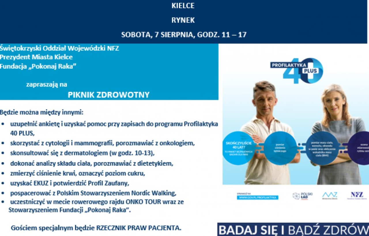Od godziny 10 do 17 można będzie wykonać bezpłatne badania profilaktyczne, organizowane we współpracy ze Świętokrzyskim Centrum Onkologii, w tym między innymi ciśnienie krwi, poziom cukru, mammografię, cytologię, dokonać analizy składu ciała, a także nauczyć się samobadania piersi, założyć Profil Zaufany, Europejską Kartę Ubezpieczenia Zdrowotnego, czy zapoznać się z portalem DIETY.NFZ.GOV.PL, programem 8 TYGODNI DO ZDROWIA oraz z cyklicznymi akcjami „Środa z profilaktyką”. Będzie także możliwość rozmowy z onkologiem, dermatologiem i dietetykiem. Gościem specjalnym będzie Bartłomiej Chmielowiec, Rzecznik Praw Pacjenta.