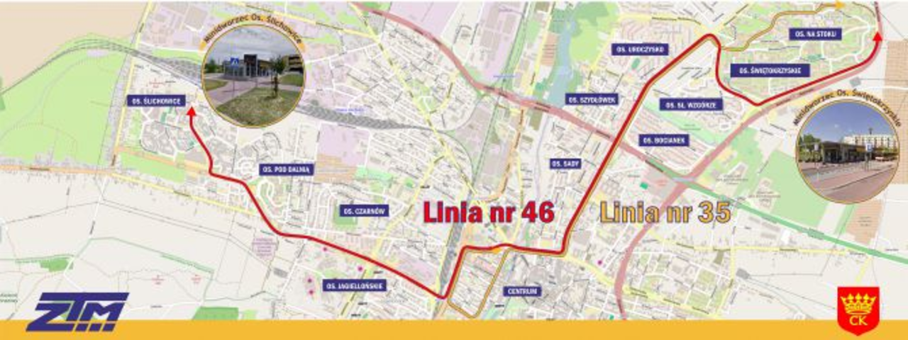 Autobusy linii 46 będą kursować na trasie: Oś. Ślichowice (pętla) – Massalskiego – Szajnowicza-Iwanowa – Grunwaldzka – Żelazna – Czarnowska - IX Wieków Kielc – Warszawska – Jaworskiego – Jeziorańskiego – os. Świętokrzyskie (pętla). Natomiast linia 35 pojedzie trasą: Sikorskiego (pętla) – Orląt Lwowskich - Warszawska - IX Wieków Kielc – Paderewskiego – Żytnia - Żelazna – Czarnowska – IX Wieków Kielc – Warszawska – Orląt Lwowskich –Sikorskiego (pętla).