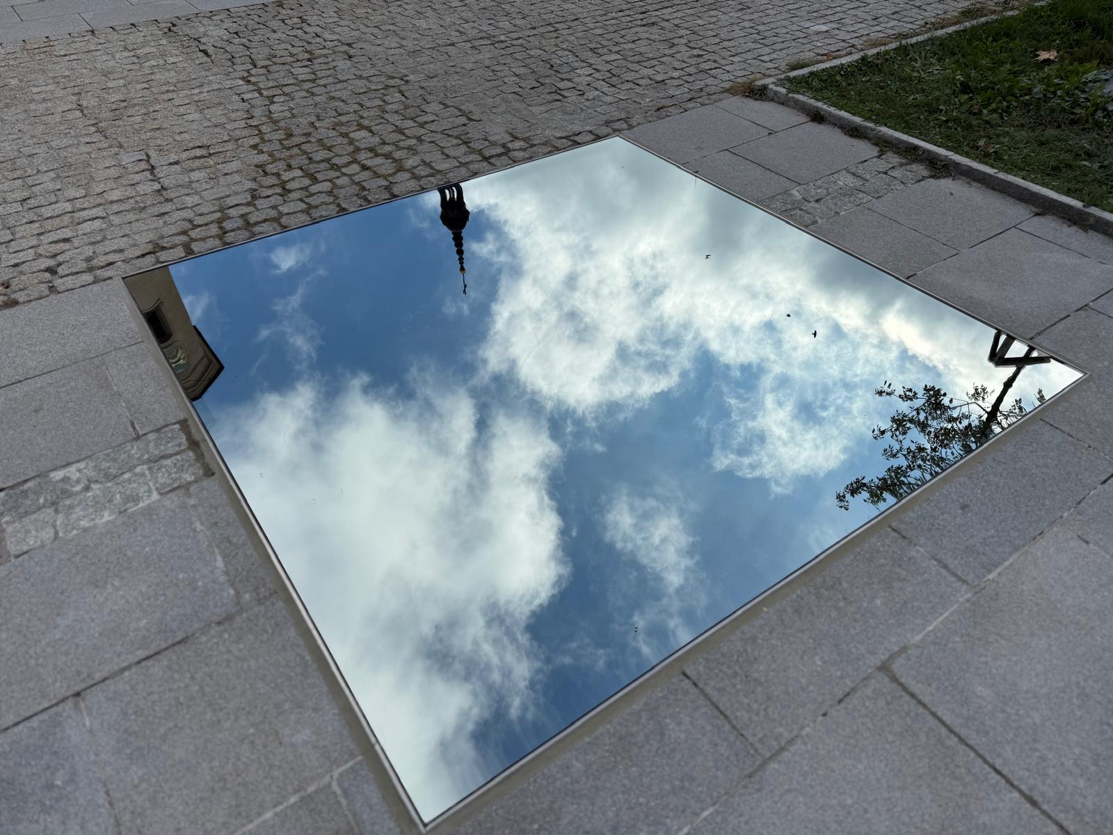 Jak czytamy w opisie instalacji autorstwa Marka Cecuły: „Szklana tafla o wymiarach 2 m x 2 m z powłoką lustrzaną została osadzona w powierzchni chodnika, integrując się z otoczeniem i tworząc w płaszczyźnie placu efekt ruchomego obrazu”.