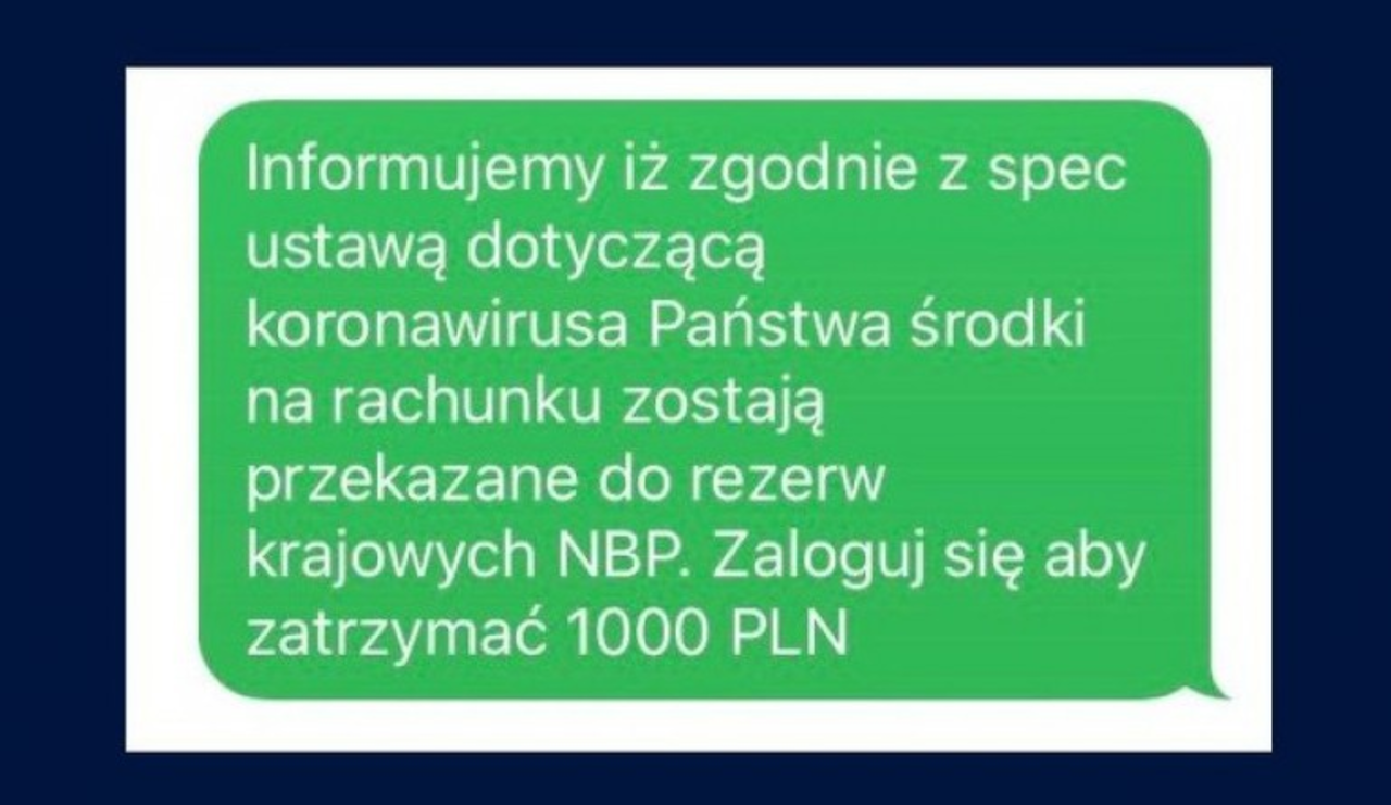 Banki ostrzegają swoich klientów przed fałszywymi SMS-ami o rzekomym przekazaniu środków z kont klientów do rezerw NBP. Oszuści próbują wykorzystać epidemię koronawirusa do wyłudzenia pieniędzy.