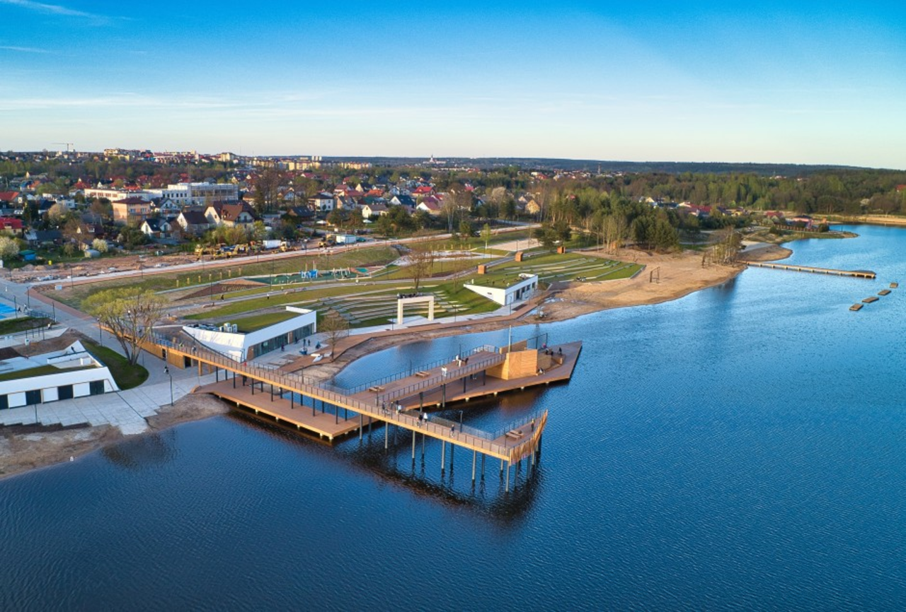 Na brzegu wybudowano trzy budynki: gastronomiczny (gdzie będzie prowadzona restauracja), wypożyczalnię sprzętu wodnego oraz sanitariaty. Nieopodal wody znajduje się amfiteatr z miejscami dla publiczności, który będzie areną wielu wydarzeń artystycznych i kulturalnych.