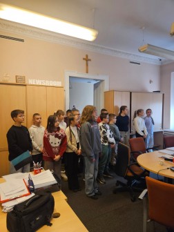 Poznali zasady pracy dziennikarzy, zobaczyli jak wygląda serwis lokalny „od kuchni”, udzielili wywiadu i nagrali świąteczne życzenia. Siedzibę Radia eM Kielce odwiedzili dziś (16 grudnia) uczniowie Szkoły Podstawowej im. Edmunda Niziurskiego w Słopcu.