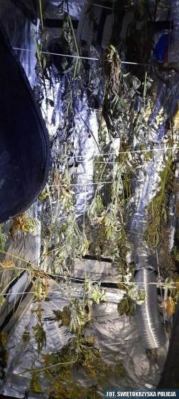 Z kolei na strychu mundurowi natknęli się na czarny namiot, w którym suszyły się konopie. Łącznie kieleccy funkcjonariusze przejęli ponad kilogram ziela.