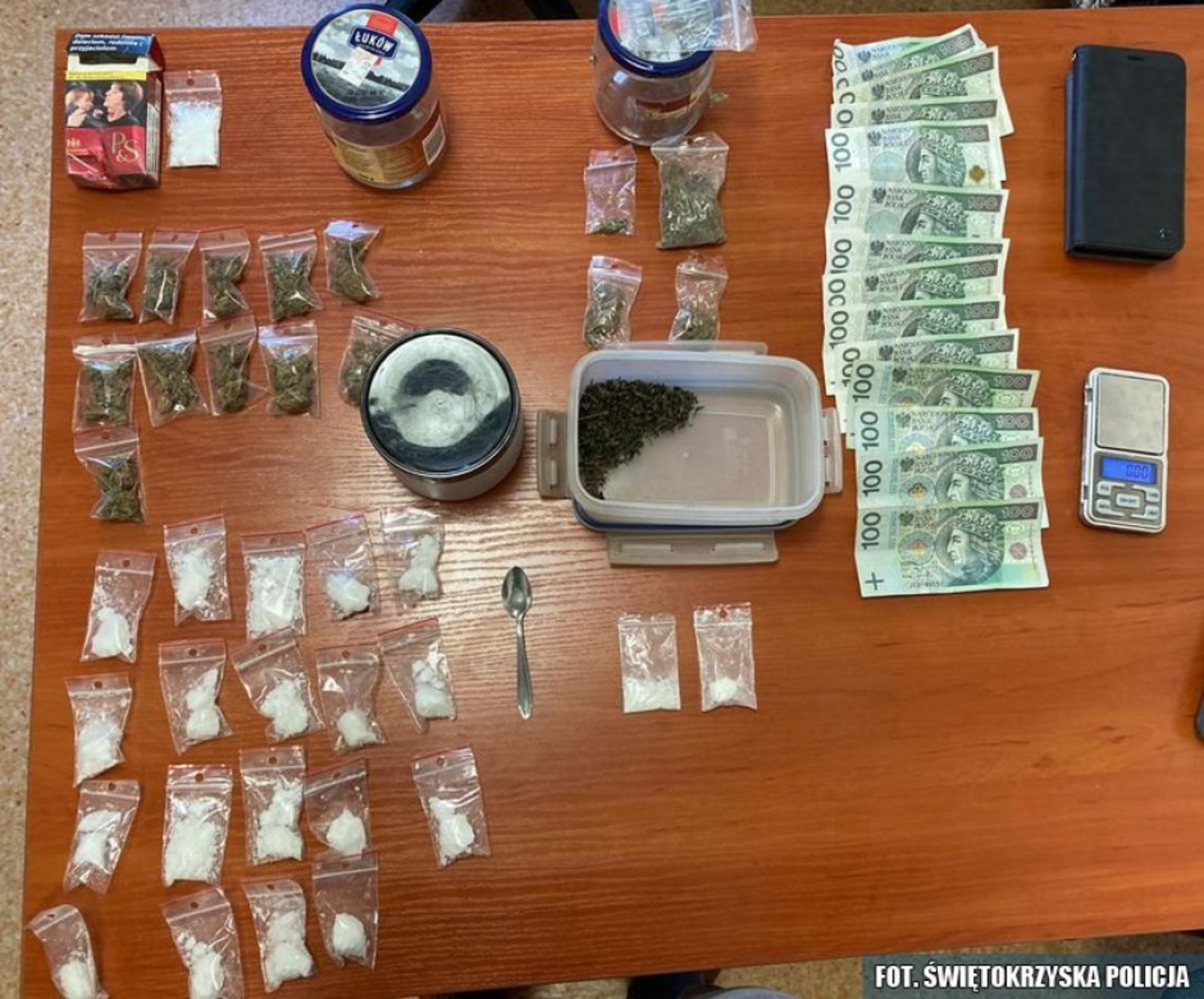 - W trakcie interwencji mundurowi znaleźli przy nim dwa zawiniątka z zawartością suszu roślinnego, wstępnie zidentyfikowanego jako marihuana i prawie 60 gramów amfetaminy. Kolejne czynności doprowadziły do zatrzymania 41-latka. W jego domu, oprócz narkotyków, funkcjonariusze zabezpieczyli pieniądze, wagę elektroniczną oraz dwa telefony – informuje Paweł Kusiak z Komendy Powiatowej Policji w Starachowicach.