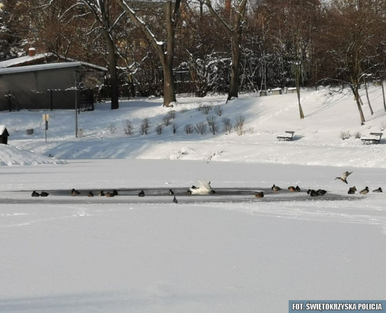 - Zawiadomienie zostało potraktowane przez dyżurnego bardzo poważnie i do obsługi zadysponowano patrol. Po dojechaniu na miejsce, jeden z mundurowych szedł wraz ze zgłaszającym i nadawali ptakowi odpowiedni kierunek marszu. Drugi z funkcjonariuszy jechał radiowozem i przy użyciu świateł błyskowych dbał o bezpieczeństwo pilotujących łabędzia, a także ostrzegał innych kierujących przed nietypową sytuacją – informuje Tomasz Piwowarski z Komendy Powiatowej Policji w Busku-Zdroju.