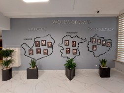 Na jednej ze ścian zawieszono wizerunki byłych wojewodów kieleckich i świętokrzyskich. Budynek oddano do użytku w latach 70. XX wieku.