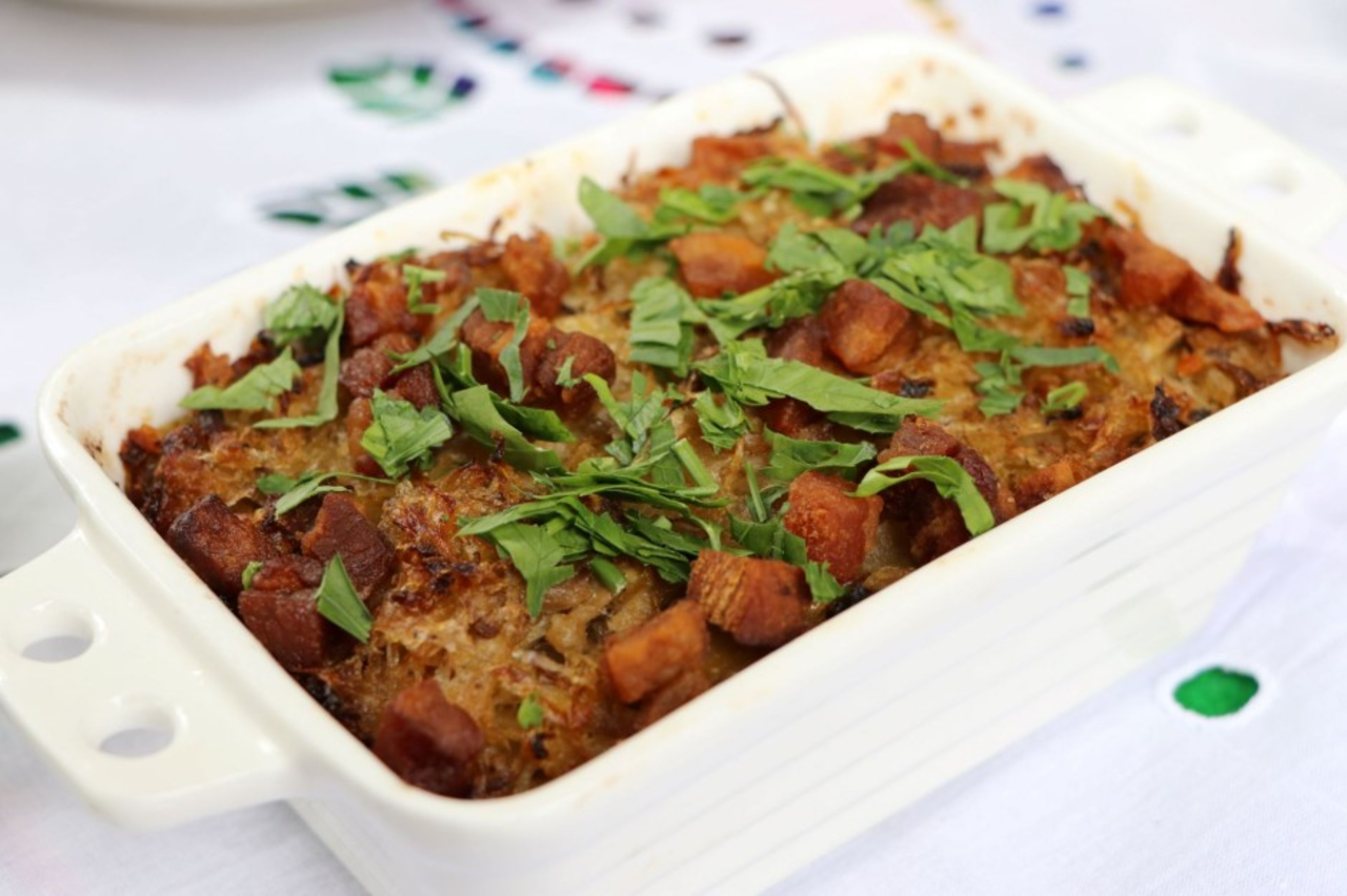 - Unowocześnienie potrawy polegało na tym, że dodałyśmy kapustę kiszoną doprawioną pieczarkami i cebulą. To wszystko razem udusiłyśmy. Budowa tej potrawy jest dosyć prosta. Najpierw położyłyśmy warstwa pigołów, a następnie warstwa kapusty. Ilość poziomów zależy od wysokości pojemnika, jeśli ktoś ma większe naczynie kluski można układać na zmianę z kapustą. Na koniec okrasiłyśmy nasze danie tłuszczem wysmażony z surowego boczku i słoniny. To wszystko zapiekłyśmy w temperaturze 180 stopni – opowiada o zwycięskiej potrawie Anna Dziewanowska.