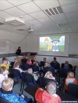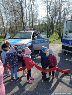 Dzisiejsza wizyta rozpoczęła się od pokazu tresury psa służbowego. Przewodnik psa policyjnego zaprezentował posłuszeństwo czworonoga i omówił jak bezpiecznie zachować się w kontakcie z psem. Przedszkolaki oglądały także policyjne radiowozy i motocykle, zarówno te które poruszają się po ulicach naszego regionu jak i te wykorzystywane w szczególnych warunkach.