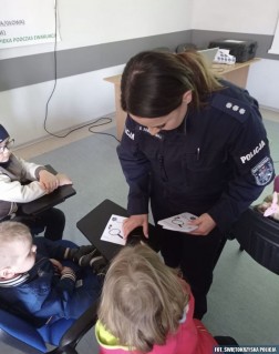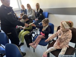 Dzieci dowiedziały się także kim jest policjant dyżurny i czym się zajmuje, wysłuchały policyjnych porad dotyczących bezpieczeństwa oraz sposobów unikania zagrożeń. Dużym zainteresowaniem cieszyło się również pobieranie odcisków palców na karcie daktyloskopijnej.