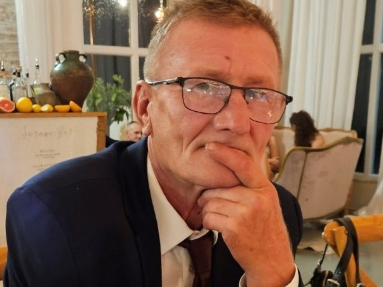 Mężczyzna jest średniego wzrostu, szczupłej budowy ciała, ma krótkie, jasne włosy, niebieskie oczy.