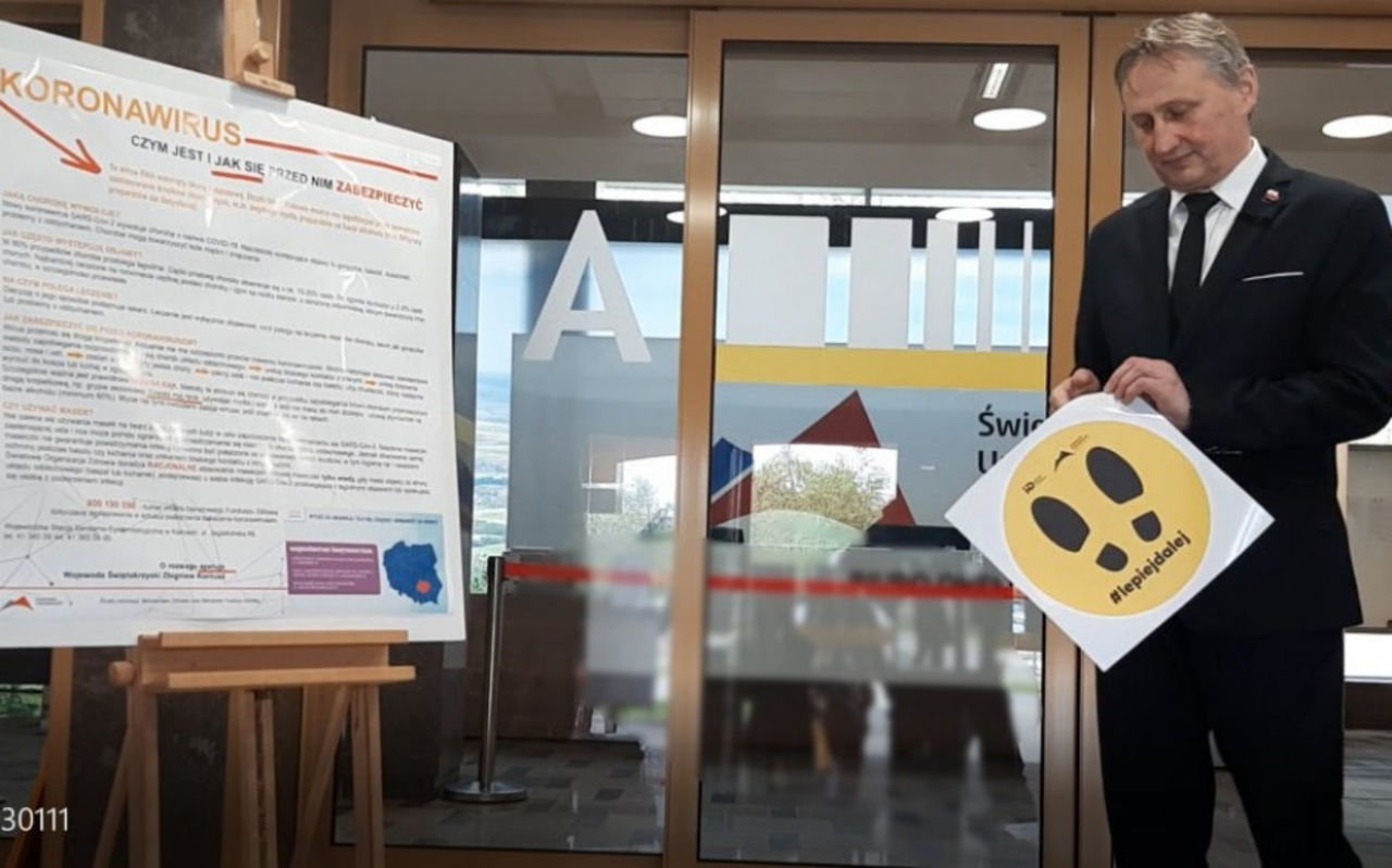 Wojewoda świętokrzyski Zbigniew Koniusz włączył się w akcję #lepiejdalej prowadzoną przez Instytut Dizajnu w Kielcach. Naklejki, które pomagają zachować właściwą odległość i bezpieczeństwo, trafiły do Urzędu Wojewódzkiego w Kielcach.
