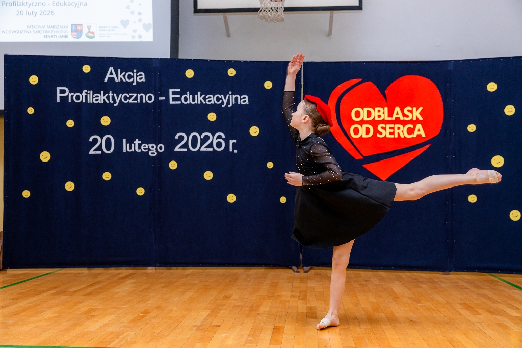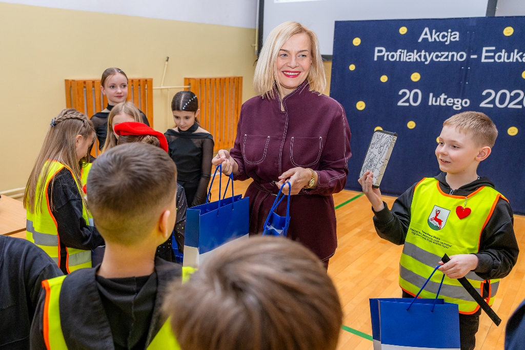 Kulminacyjnym momentem było wręczenie odblasków dzieciom oraz seniorom. Przekazali je marszałek województwa oraz funkcjonariusze Policji. Część oficjalną uzupełniły występy artystyczne uczniów. Poprowadziła je uczennica klasy VII Kaja Kończak. Na scenie zaprezentowali się uczniowie klas II i III przygotowani przez Ewę Mazur. Wystąpiły także tancerki zespołu „Magic”. Solowy układ wykonała Wiktoria Góźdź, a duet zaprezentowały Laura Hińcza i Urszula Stączek. Choreografie przygotowała Ewelina Barwicz.