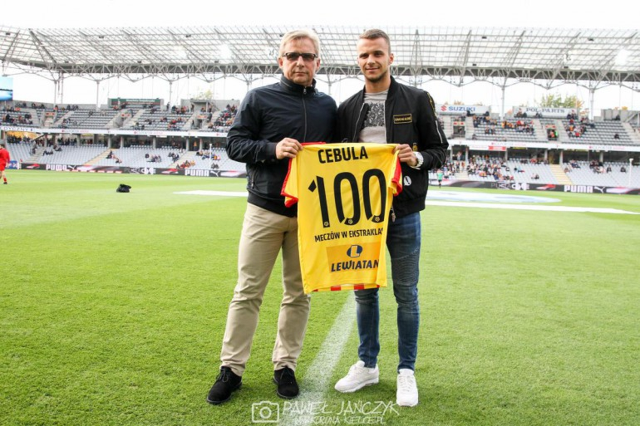 Cebula przed rozpoczęciem spotkania z Jagiellonią z rąk prezesa Korony, Krzysztofa Zająca, odebrał pamiątkową koszulkę z liczbą "100". Skrzydłowy po raz sety w ekstraklasie zagrał w ubiegłotygodniowym starciu z Wisłą Kraków.