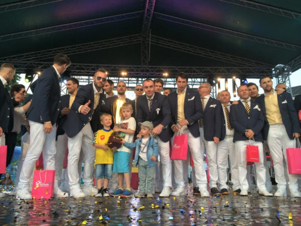Wtedy zaczęło się wielkie świętowanie. Spikerzy wyczytywali nazwiska głównych bohaterów wieczoru, a ci przy swoich ulubionych utworach przechodzili przez tłum fanów na scenę. Prowadzący zadawali każdemu zawodnikowi po jednym pytaniu. I tak dowiedzieliśmy się, że Marinowi Sego najbardziej utkwił w pamięci obroniony karny w ostatnim finałowym pojedynku z Orlen Wisłą Płock, a Sławomir Szmal i Krzysztof Lijewski zapowiadali, że w przyszłym roku obok pucharów za zdobycie mistrzostwa Polski i Pucharu Polski, stanie jeszcze trofeum za zwycięstwo w Lidze Mistrzów. Natomiast Michał Jurecki przyznał, że w tym sezonie nikt bardzo nie zaszedł mu za skórę, ale w przyszłym będzie to na pewno jego brat Bartosz, który zagra w Chrobrym Głogów. Jednak najszczęśliwszy na scenie był Piotr Chrapkowski. Rozgrywający obok sukcesów klubowym świętował przede wszystkim narodziny córki Sary. - Uprzedzając twoje pytanie Paweł, nie wiem, który mecz zapadł mi najbardziej w pamięci, ale może to być ten dzisiejszy z dogrywką - mówił do Pawła Papaja, na co dzień spikera na spotkaniach Vive Tauron.