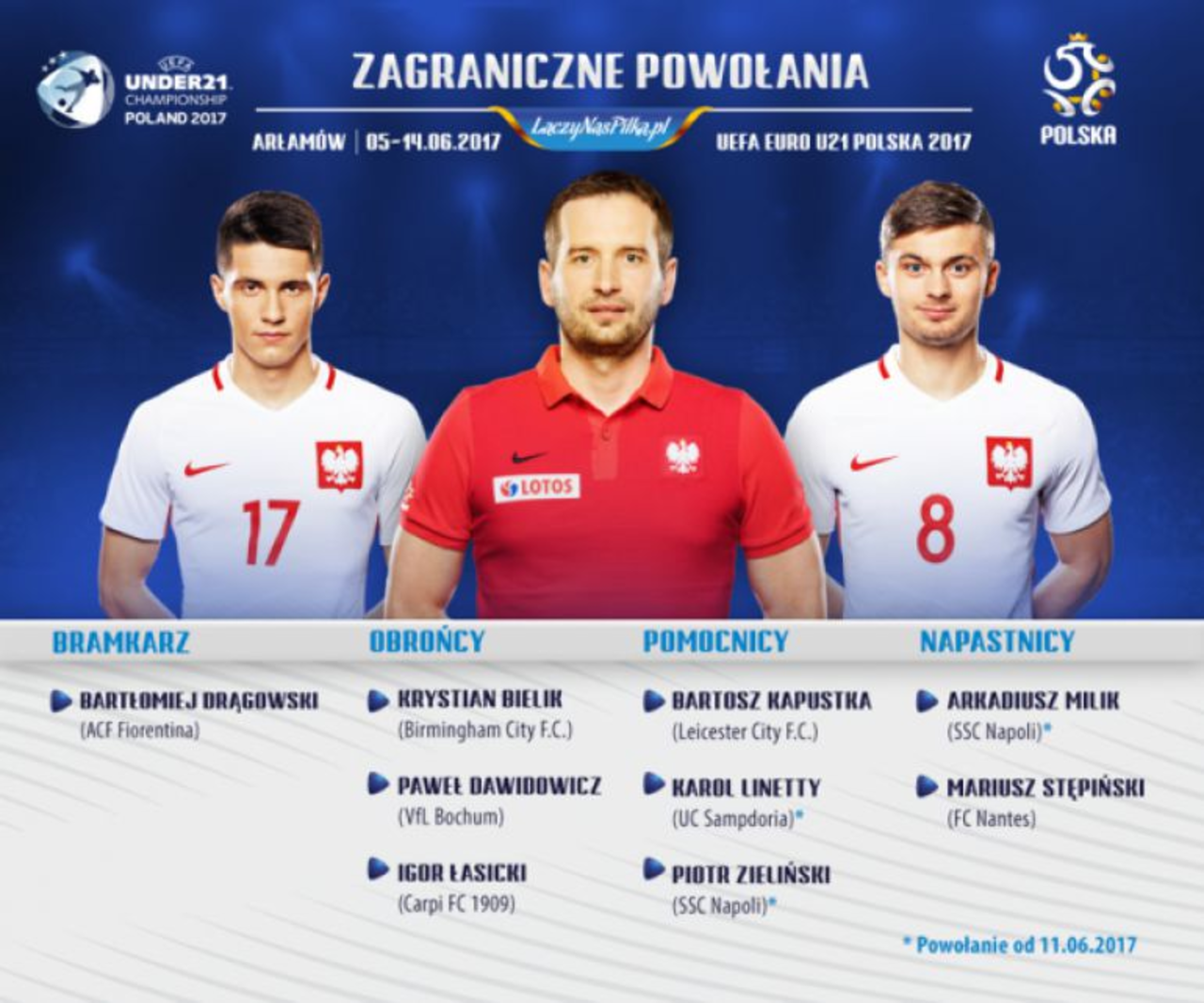 Długo nie było wiadomo czy w turnieju udział wezmą zawodnicy, którzy mają już ugruntowaną pozycję w pierwszej reprezentacji. Ostatecznie trener Adam Nawałka zgodził się, aby po meczu eliminacji do mistrzostw świata z Rumunią (10 czerwca) do polskiej „młodzieżówki” dołączyli występujący na co dzień na boiskach Serie A - Milik, Zieliński (Napoli) i Linetty (Sampdoria Genua). Powołania zaakceptowały również kluby wymienionych piłkarzy.