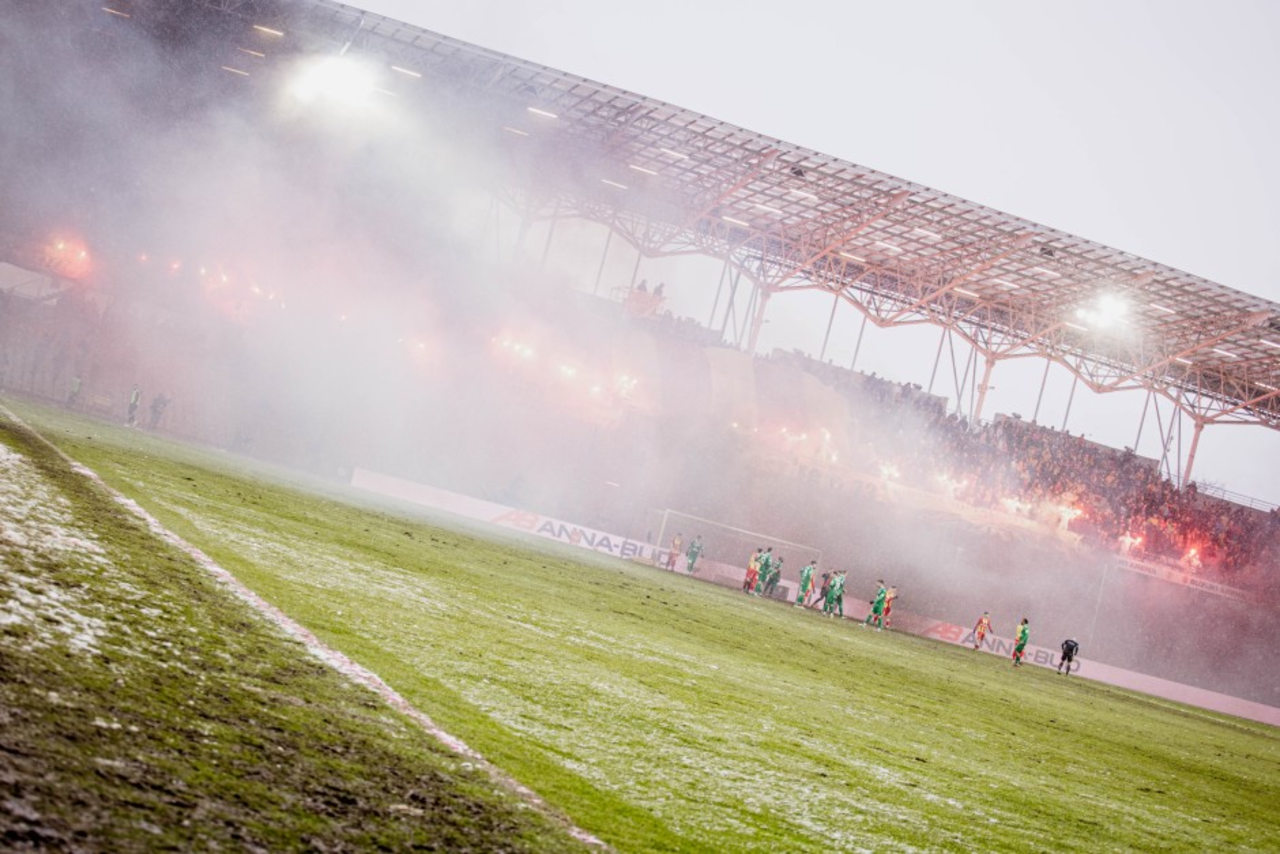 Podczas sobotniej “Świętej Wojny” kibice obu stron odpalili race, przez co spotkanie było wstrzymane na kilka minut. Fani Radomiaka wykazali się skrajną głupotą i rzucali nimi w kierunku sektorów zajmowanych przez gospodarzy. Jeszcze w trakcie spotkania doszło do bezpośredniej konfrontacji między pseudokibicami. Interweniować musiał oddział prewencji policji.