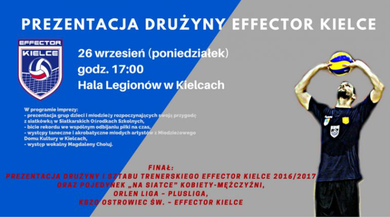 Siatkarze Effectora Kielce coraz bliżej rozpoczęcia sezonu PlusLigi. Już w poniedziałek odbędzie się oficjalna prezentacja nowego zespołu. W planach jest między innymi bicie rekordu w odbijaniu piłki przez młodych adeptów Siatkarskich Ośrodków Szkolnych, pokazy taneczne i wokalne, konkursy oraz pojedynek Effectora Kielce z siatkarkami KSZO Ostrowca występującego w Orlen Lidze.