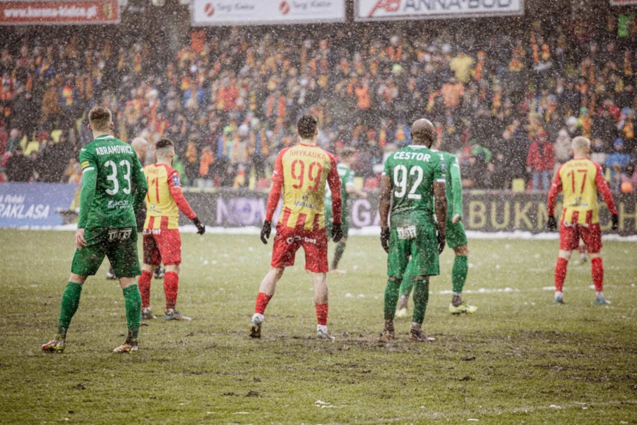 W drugiej części tempo spadło. Było też przerywane przez kibiców, którzy odpalili race. Najpierw zrobili to fani „żółto-czerwonych”, w końcówce gości. Oni zachowali się nieodpowiedzialnie i kilka z nich rzucili w kierunku sektorów zajmowanych przez kielczan. Szymon Marciniak doliczył dziesięć minut.