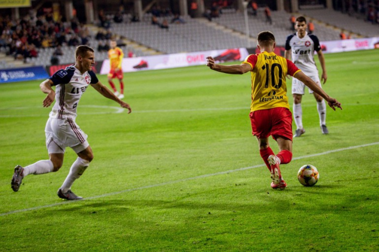 We wtorkowy wieczór trybuny Suzuki Areny świeciły pustkami, a piłkarze w pierwszej połowie niespełna dwóm tysiącom kibiców zaprezentowali mocno przeciętne widowisko. Dłużej przy piłce utrzymywało się Zagłębie, które często starało się atakować skrzydłami. Bliżej zdobycia bramki byli jednak "żółto-czerwoni". W 25. minucie po dośrodkowaniu z rzutu rożnego Mateja Puczki przed szansą stanął Themistoklis Tzimopoulos, ale jego uderzenie z głowy przeleciało minimalnie obok słupka. W 38. minucie po ładnej wymianie na linii Puczko – Żyro, pierwszy z nich oddał strzał z szesnastu metrów, ale piłka powędrowała wysoko nad poprzeczką.